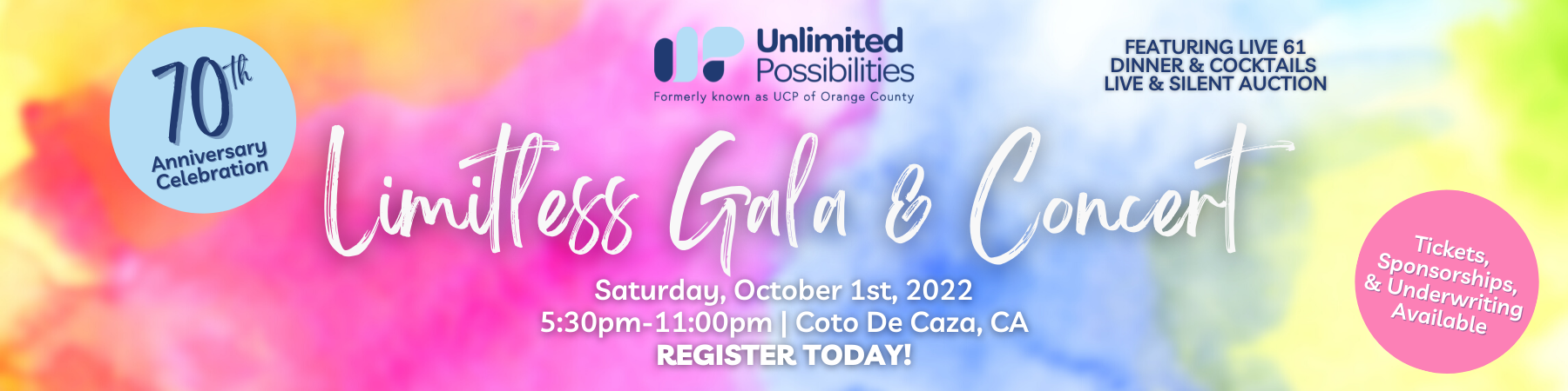 You can still participate!Hosted at a luxurious, private estate in Coto De Caza, California, this one-of-a-kind gala & concert will be a celebration of Unlimited Possibilities' inspiring 70-year-history. The event will include delicious food, drinks all night, live entertainment, and the best hits to dance the night away! All proceeds will benefit children and families with disabilities served at Unlimited Possibilities.