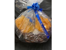 Johnson & Wales Kitchen Basket: Ceramic wine bottle holder, wooden hot plate, cutting board, spatula, pepper mill, glass holder, JWU executive pen, two side towels, and a small notebook