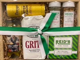 Reid's Southern Crate: Includes Pickled Okra, Crook's Corner Grits, Hot Cheddar Cheese Straws, Spiedie Rub, & Coarse Steak Seasoning; $50 gift card to Tiff's Treats;