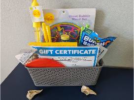 The basket includes bubbles, water balloons, a swim cap, a pool toy, and a bubble set