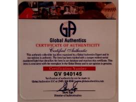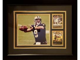 A Drew Brees Autographed Rookie card that has been matted and framed with an additional card and photograph. The autographed rookie card has been certified authentic by Global Authentics and comes with a full Letter of Authenticity. The finished size of the item is 18" wide x 14" tall.