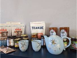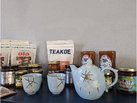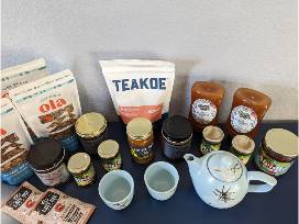 Local Colorado jams, honey, tea, and oatmeals with an Asian tea set