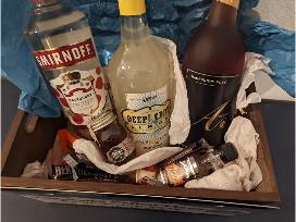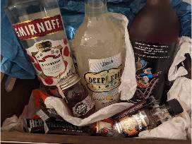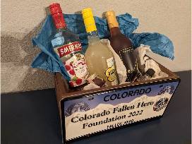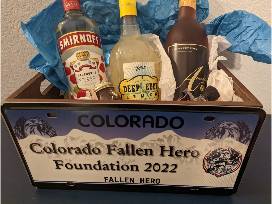 Bottle of Smirnoff, Deep Eddy Lemonade, Raspberry Rose wine, Ole Smokey travel size, Jim Bean Honey, and a personalized Fallen Hero License plate.