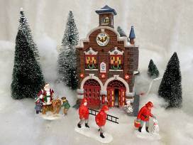 This city firehouse scene is the perfect addition to your Christmas in the City series. The centerpiece of this tableau is the beautifully detailed brick firehouse with brass tower bell and light-up alarm lights. Out front, Santa, one of his reindeers, and two children look on as three wintery firefighters carry out their duties. It's a timeless scene sure to capture the imaginations of all ages.