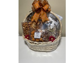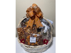 Basket includes: Popular Chocolate Assortment, Sweet and Salty Snack Mix, Almond Toffee Crunch, Cashews, Bite Size Truffles, Gourmet Chocolate Maltballs. and Milk Chocolate Non Pariels.