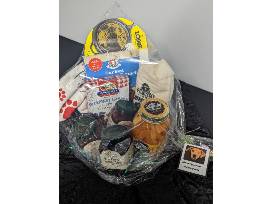 This basket includes a selection of jams, oven mitts, Ole Smoky Moonshine, a cookbook, a Cast Iron Skillet from "Lodge Cast Iron" with "We Can Do It" from Rosie the Riveter, engraved on the bottom, plus more!