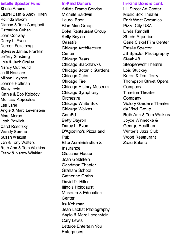 We are delighted to feature Broadway tunes performed by the city's award-winning Porchlight Music Theatre at this year's benefit celebration. Through live performance, youth education, and community outreach, Porchlight delights thousands of people each season. It has built a national reputation for boldly reimagining classic musicals, supporting new works and young performers, and showcasing Chicago's most notable music theater artists, all through the intimate and powerful theatrical lens of the "Chicago Style." At the benefit, they'll pay a special tribute to the late Estelle Spector, who was co-chair of this event for many years and very active in other aspects of the Village.
