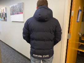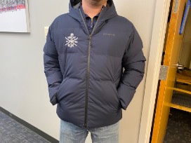 MSU skiing embroidered navy-blue Patagonia Jacket. windproof, weather-resistant and insulated with warm, 700-fill-power 100% Recycled Down.