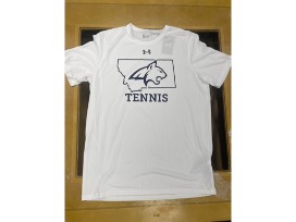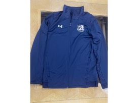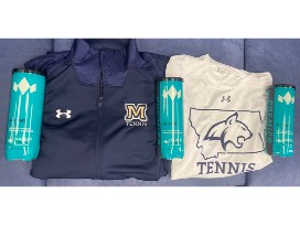 Men's medium navy blue tennis hoodless jacket, men's medium white tennis short sleeve T-shirt, and 9 Diadem Premier high altitude tennis balls.