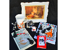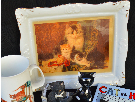 A cat lovers collection of a charming ceramic plate with a vintage cat photo, orange tabby cat mug, 3 cat figurines, cat magnets, 2 cat-themed books, a Cat Lady keychain and 3-D cat playing cards with a different cat image on each card. Fun! ~Donated by Milli Barton, Bill Crowe, Janie Duncan and Kourtnie Good