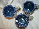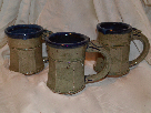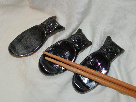 3 large cat mugs and 3 cat chopstick rests, with wooden chopsticks, by Nicholas Holland, ceramicist. California artist who uses vegan glazes and all vegan/cruelty-free materials. ~Donated by Nicholas Holland