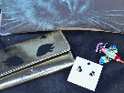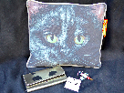 Wonderful throw pillow of a black cat with green eyes, a metallic gold wallet with black cat eyes, earrings of black cats wearing rhinestone collars, and a hand beaded bird keychain. ~Donated by Bill Crowe and Milli Barton