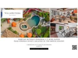 Ultra-luxury vacation home located in central Palm Springs and decorated by renowned interior designer Barclay Butera. This Spanish-style hacienda features four bedrooms, each with ensuite bath and walk-in closet. Villa Butera's lush grounds surround the villa and offer guests numerous outdoor seating areas and amenities: a pool and spa, built-in gas firepit, outdoor lounge chairs and dining areas, and grill. Ideally located in the Historic Movie Colony and 5 minutes to downtown.
