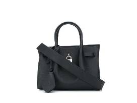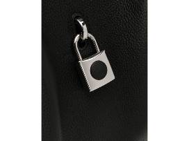Belted opening, with decorative silver-tone padlock details. Two rolled top handles, detachable flat leather crossbody strap. Magnet clasp. Opens to two interior compartments.
