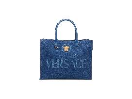 From the La Medusa Collection. Highlighted with the instantly recognizable Medusa head plaque, Versace's book tote boasts a denim construction. This Italian-made piece is finished with a bold embossed logo at the front.