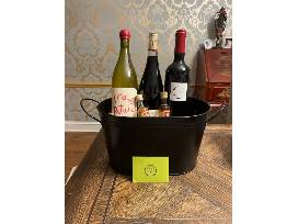 Enjoy a basket includes three (3) bottles of wine and a metal ice bucket from Bottles & Cans.