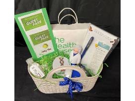 Swag bag includes notepad, hand sanitizers (one with keychain), silicon card holder for phone, silicon "End Cancer" bracelet, coaster, bookmark, pen, and toy Einstein.