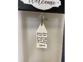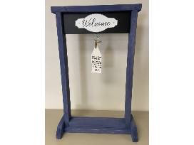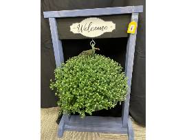 Blue stained "Welcome" hanging basket display holder made by Rolando Tolentino; plant included