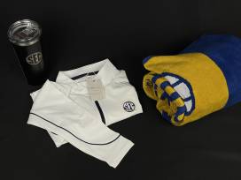 Show your SEC pride! This bundle includes a white women's Large Peter Millar quarter zip pullover, a black SEC tumbler, and a fun heavy weight blue and yellow SEC beach towel.