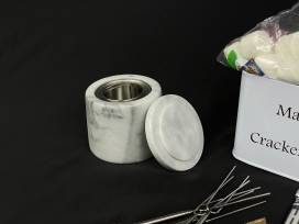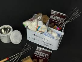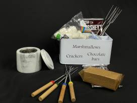 You don't need a backyard fire pit to enjoy s'mores year around. This marble table top fire pit* is the perfect solution indoor or out. It has a silicone pad to protect your surface, an inner chamber for fuel and a marble lid for safely extinguishing the flame. The kit includes 8 wood telescoping roasting sticks and an adorable divided carrying tin filled with graham crackers, Hershey bars and marshmallows. Use this to make s'more family memories!