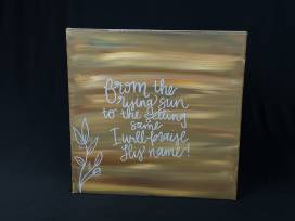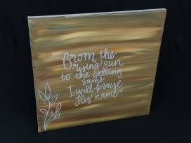 This beautifully painted canvas will brighten any room! Featuring lyrics from the worship song, Promises by Maverick City, these lyrics "From the rising sun to setting same I will praise Your Name" is the perfect encouragement to hang on your walls! An original by Morgan Mauney.