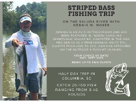 Fishing Experience - You and up to two guests of your choice have a half-day in Columbia, SC on the Saluda River with Dennis Moser. Dennis has been featured in "North Carolina Sportsman" magazine, competed in AWA Pro Series and has appeared on the Outdoor & Pursuit Channel. You can catch 20-100 fish ranging from 5-40 pounds! You don't want to miss this!!