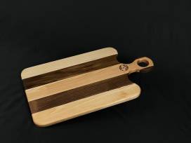 This gorgeous tri-wood edge-grain charcuterie board is perfect for entertaining. It's crafted with the wood oriented horizontally along the grain for maximum resistance to stains, water and warping. With alternating Oak, Maple, and Walnut pieces this board is functional as well as beautiful!