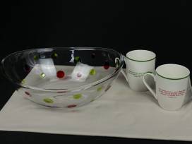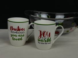 Here's a festive touch of Christmas for the holiday season. The cute acrylic serving set - 1 large bowl and 4 small bowls is perfect for a salad or some popcorn! And as you sip your cider, you'll be inspired by the reminders for the season on these 2 Christmas ceramic mugs (hand wash only.)