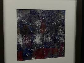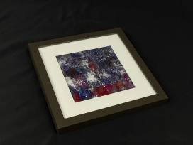 This subtle leaf print shimmers in silver with navy and red accents. The square frame makes it stand out even more. This print was made by some of our Rainbow Young Adults as they learned the art of Gelli printing.