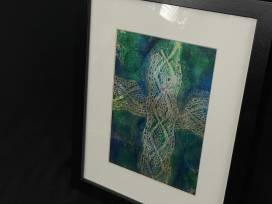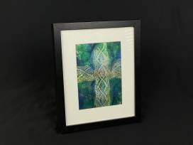 The blues and greens of this print highlight the delicate lace cross that's kissed with gold. It comes matted in white with a black frame. This handmade print was made by some of our Rainbow Young Adults as they learned the art of Gelli printing.