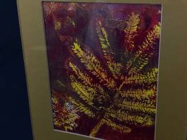 This distinctive leaf print is highlighted by the brilliant yellows and reds. Matted in Dijon with frameless glass this piece is a stunner. This handmade print was made by some of our Rainbow Young Adults as they learned the art of Gelli printing.