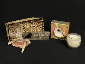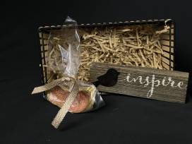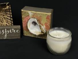 This basket has the perfect little knick-knacks to add to those shelves for just the right accents. Hand painted by Diane Belk, stand alone decoupage oyster paired with a mounted decoupage oyster on a hand painted canvas and a wooden "inspire" sign are sure to add the perfect final touch. A handmade "Fall Harvest" scented Rainbow candle in a vintage glass container is also included in this bundle.