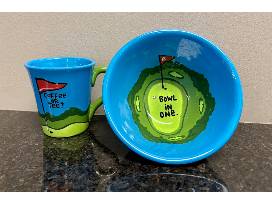 This basket contains a gently used, golf themed bowl and mug set, $50 gift card to Aurelio's Pizza, and 2 sleeves of Top Flite golf balls.