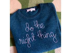 A customized sweater from Lingua Franca, the sustainably-sourced luxury cashmere brand hand-stitched by women in NYC.