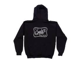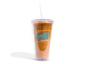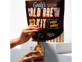 Grab bag of stuff from Grady's Cold Brew, including a clear tumbler, a hoodie, and of course, a bottle of super strong elixir of life.