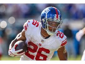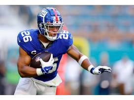 A New York Giants jersey signed by #26 running back Saquon Barkley.