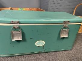 Teal antique cooler for your winter decor. Cute but not functional as a cooler.