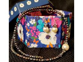 Handmade, 19", Hawaiian Pearl Necklace with Matching Earrings. This set sparkles with Sterling Silver, Gray and White Pearls and Swarovski Crystals accents.