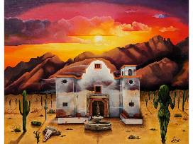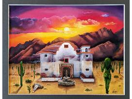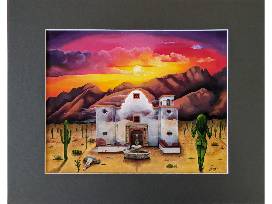 Original artwork from a Tucson-based artist inspired by the Gala's theme of Hollywood Western, and features the Old Tucson Studio's Mission building. The mountain range in the background is a portion of the Catalina foothills.