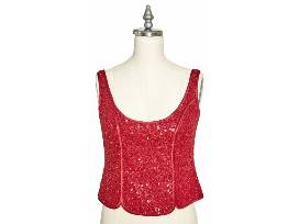 Beautiful Bob Mackie top worn by Carol Burnett to the 2005 TV Land Awards. Beaded top with a scoop neck, shoulder straps, and beaded in panels trimmed in red silk. Unlabeled.