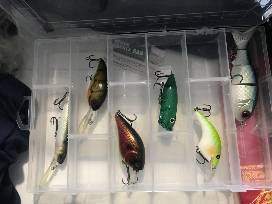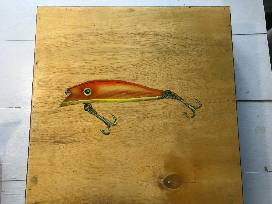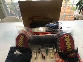 6 custom painted Lures, 3 Tray Soft Tackle bag, 2 Huge Bags of Zoom Baits Company Worms, Zoom hat and shirt, Franklin's Sporting Goods Shirt and spinning, $50 Gift Card Bass Pro, and Custom hand painted Lure art.