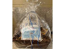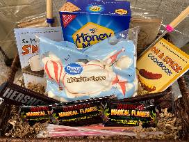 This S'mores basket contains roasting sticks, color your fire magical flames, campfire recipe cookbooks, graham crackers, chocolate bars, marshmallows, popcorn, and glow sticks.