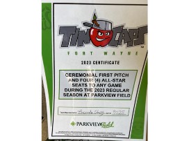 Ceremonial First Pitch and 4 All-Star Seats to any game during the 2023 regular season at Parkview Field. 4 TinCaps hats are included, as well as a TinCaps cinch bag and a TinCaps cutting board.