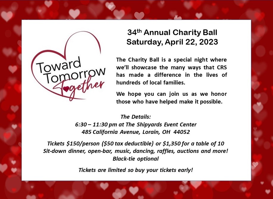 I am very excited that you will be joining us for the Charity Ball on Saturday, April 22, 2023! We will once again be at the beautiful Shipyards Event Center, 500 Shipyard Way (485 California Avenue for navigational purposes). It will be a night to celebrate CRS and all those who support us in our mission to diminish poverty in Avon and Avon Lake.