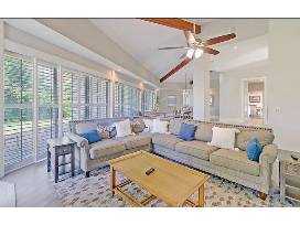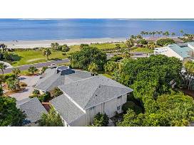 PRIME, PRIME, PRIME location! Literally steps to the Beach Club, the ocean-front pool, restaurant & Golf Club! Beautiful ocean views from the wrap around living & dining area. Great golf view also! Built for entertaining & large family gatherings w/6 bedrooms (including 1 bunkroom) & 4.5 baths. Multiple exits to the expansive outdoor patios-ideal entertaining spaces, ocean views. Interior courtyard separates house from the oversized 2-car garage. A 50' wall of windows w/custom plantation shutters, vaulted, beamed pine ceiling, stone fireplace & custom-built-ins provides the large family space a naturally bright, relaxing setting, extending to the open dining area; seats 14+.Bright recently updated eat-in-kitchen w/white cabinetry/built-ins,!),Sub-Zero fridge,. Convenient outdoor BBQ & sunning deck just out the double French doors! Upstairs owners bedroom w/private veranda, Dual vanities, tub/separate shower, WIC w/built-ins. Upper guest rooms w/golf & lagoon views. Main level has 2 guest bedrooms; one w/2 additional sleeping areas & outside access. Home sleeps 14. Custom double bronze doors, rotunda foyer w/domed skylight, hardwood compass rose set into a stone floor.