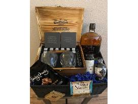Mixology Box Contains 8 Rocks, 2 Slate Coasters, 2 Glasses, Tongs, Whiskey recipe cards, Large bottle of Bulleit Rye Whiskey, Woodford Reserve Cherries, Stone Water Old Fashioned Mix, Funky Chunky Peanut Butter Cup Popcorn, Bacon Cheeseball Mix.
