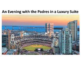 The Suite Life - 2023 Padres Season. Enjoy an "Evening with the Padres" compliments of the Sycuan Band of the Kumeyaay Nation. Included are twenty-six (26) tickets to the Sycuan luxury suite located on the Toyota Terrace Level at Petco Park, and twelve (12) parking passes to the Padres Parkade. Food and beverages (including beer) are provided. Valid for Monday-Thursday games only. Opening day, Friday-Sunday, and Play Off dates are all restricted. Winner will need to contact donor at the beginning of 2023 season to secure game date. Game date subject to availability.