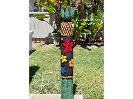 Bring some fun and character to your yard with a one-of-a-kind 6 Foot "Wahine" Tiki hand-carved and hand-painted by Tim Richards Woodcarving. The tiki was carved from a fan palm trunk and finished with two coats of Spar Polyurethane, a coating that protects the wood from all the weather elements, including light, heat, sun, and rain. This year's tiki features Tim Richards' signature pineapple top and vibrant colors to brighten up your backyard.