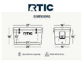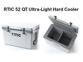 - 52 QT Ultra-Light Hard Cooler by RTIC in White & Grey. Retail value is $199.99. Donated by Tiffany Wong and Chris Leong. Forbes calls this cooler the "Best Cooler Like a Yeti" with a similar design. Reviewers rave about the durable, lightweight design and ability to keep ice and other items cold for several days. Up to 64 can capacity. Holds 40 lbs of ice. Comes with removable divider and upper basket. Outside Dimensions: Length: 27 inches, Width: 18 inches, Height: 18 inches. Inside Dimensions: Length: 21 inches, Width: 13 inches, Height: 14 inches.