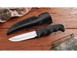 - Cutco Drop Point Hunting Knife. Versatile hunting knife with black slip-resistant handle, 4-1/2 inch Double-D Edge blade, leather sheath and leather lanyard. Made in the USA. Blade material is 440A High-Carbon stainless steel. Handle is thermoplastic elastomer. Overall length is 9-1/4 inches. Weighs 5 ounces. Retail value is $114. Donated by CUTCO Cutlery Corporation.